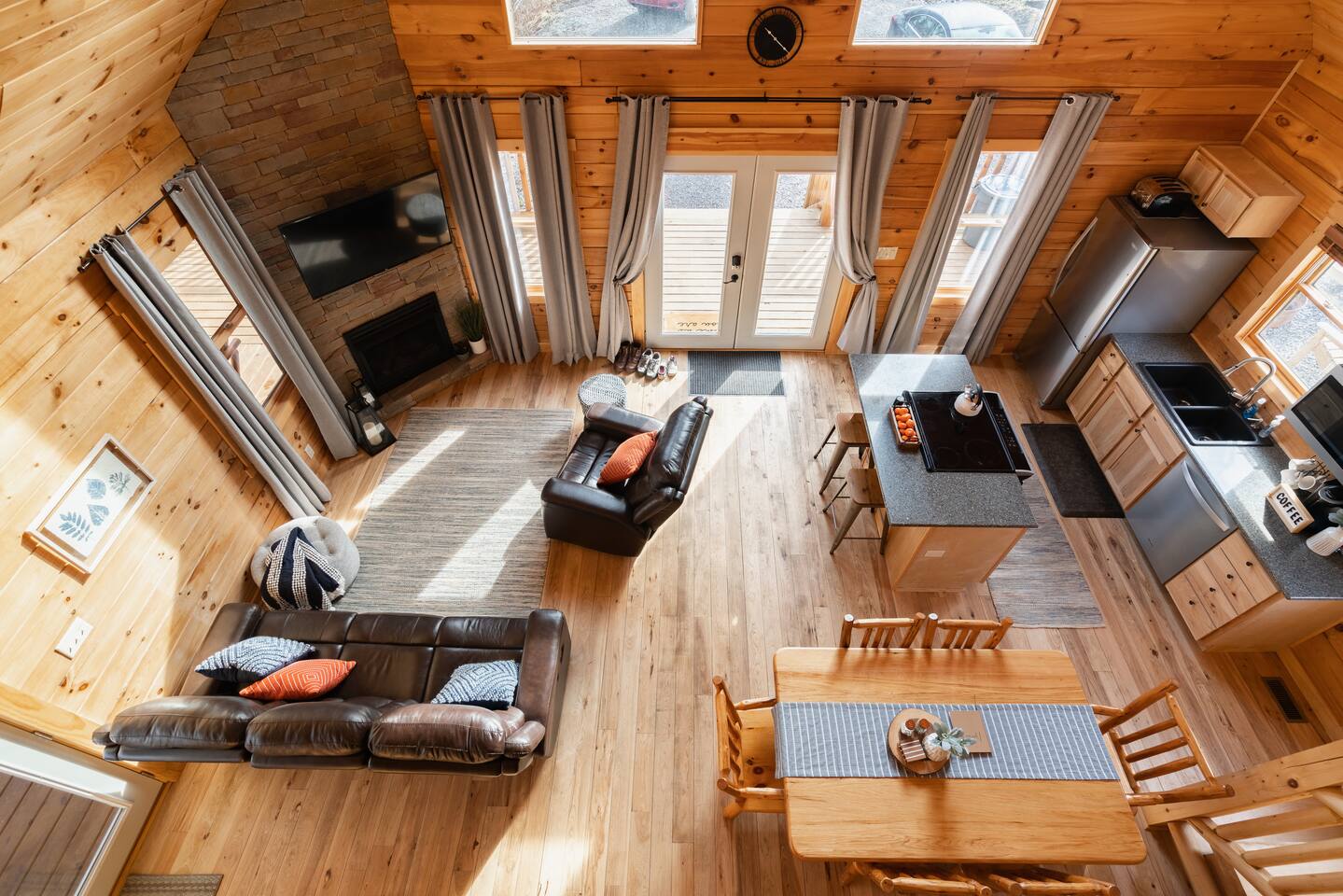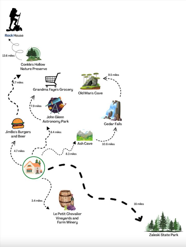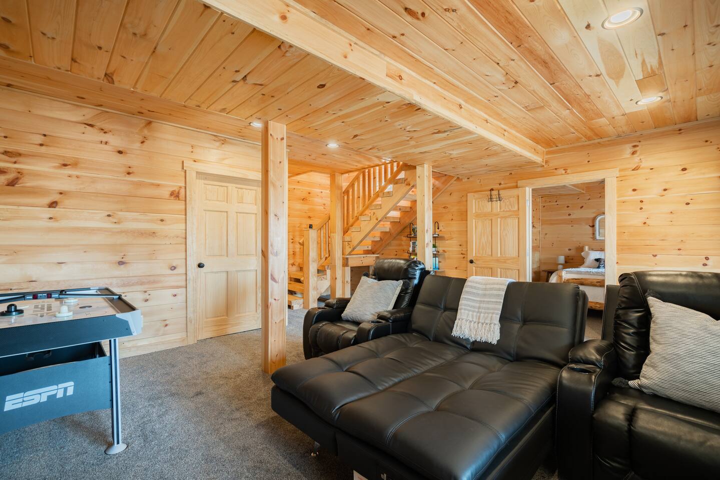 Why Choose The Madison? Set your worries aside, connect with loved ones in a serene setting, and disconnect from daily distractions. Perfect for a tranquil getaway. COMFORT: The Madison offers two queen size master bedrooms with an additional full size bed in the loft space. There is a multifunction futon allowing the cabin to be able to sleep up to a total of 8 if needed. The Madison also has a hot tub, theater like seating, cable tv, fast Starlink WiFi, a large 60" flat screen TV in the basement (and large flat screen TV on the main floor), and Roku players in each master bedrooms. We provide Hulu, Disney+, and YouTube TV (with the NFL Sunday Ticket!) with fast internet service and Starlink satellite internet (the best available in the Hocking Hills area). Each master bedroom has a spacious full en suite bathroom. CONVENIENCE: Located in the heart of the Hocking Hills region. Easy, quick access to Hocking Hills favorites, including Old Man's Cave, Ash Cave, Conkle's Hollow, Cedar Falls, and more! Abundant beauty and hiking to enjoy year round. Also convenient for Hocking Hills activities, such as zip lining, trail riding, rock climbing, and many others! Also only 6 minutes to Le Petit Chevalier Vineyards! CLEANLINESS: We employ local professional cleaners who understand that our guests want to immediately settle in and feel confident that the cabin is up to their standards. SUSTAINABILITY: The cabin has been audited by Sustonica and awarded a sustainability badge. From community involvement to eco-friendly design, we’ve created a warm escape that respects our beautiful Hocking Hills. The Madison balances the desired seclusion and proximity to the trails, caves, and waterfalls that many guests seek. You won't have to see another human during your stay if that's your preference, but can also quickly access the best hikes that Hocking Hills State Park offers (Old Man's Cave, Ash Cave, Conkle's Hollow are all within a 12-15 min drive). The cabin is also a short 7 minute drive to Le Petit Chevalier Vineyard, a gorgeous location for those wanting to visit a winery. **Guest making reservation is responsible for other guests on property and liable for damages and/or rules violations. **Despite being animal lovers and pet owners ourselves, pets are not allowed at the cabin. **The cabin is a non-smoking property, which includes both inside and outside the property and includes tobacco, natural, and vaping. **Parties/events are not allowed** Identified as one of the "Best Luxury Family Cabins" in Hocking Hills by Up And Away Magazine!